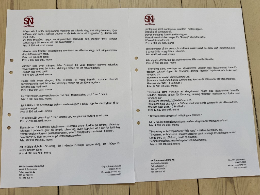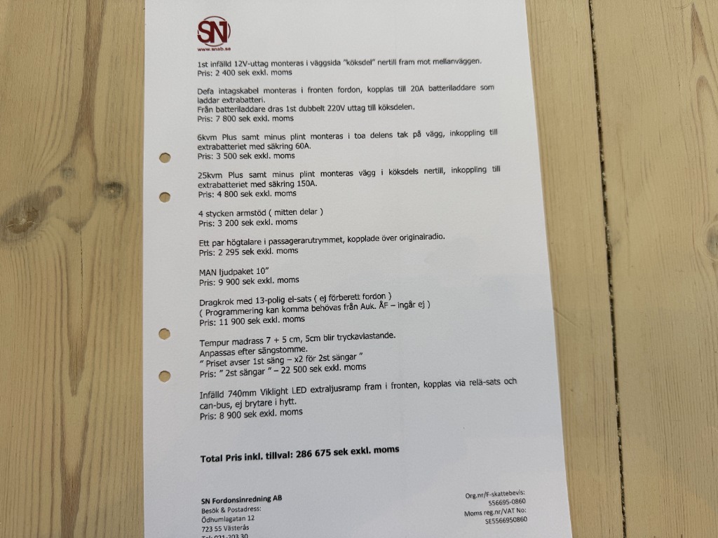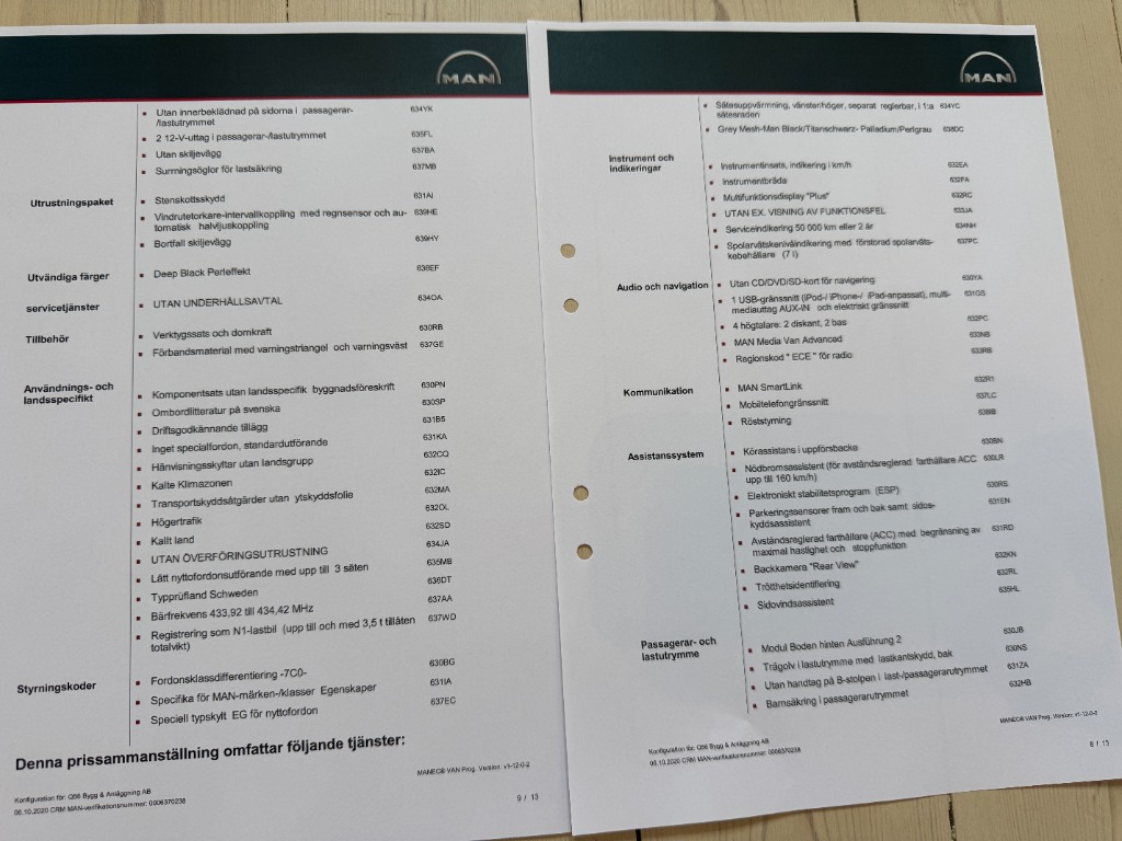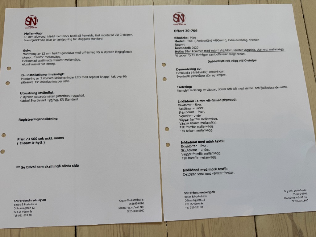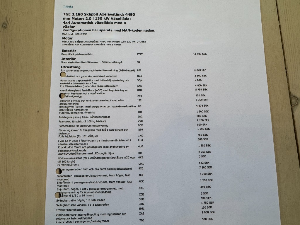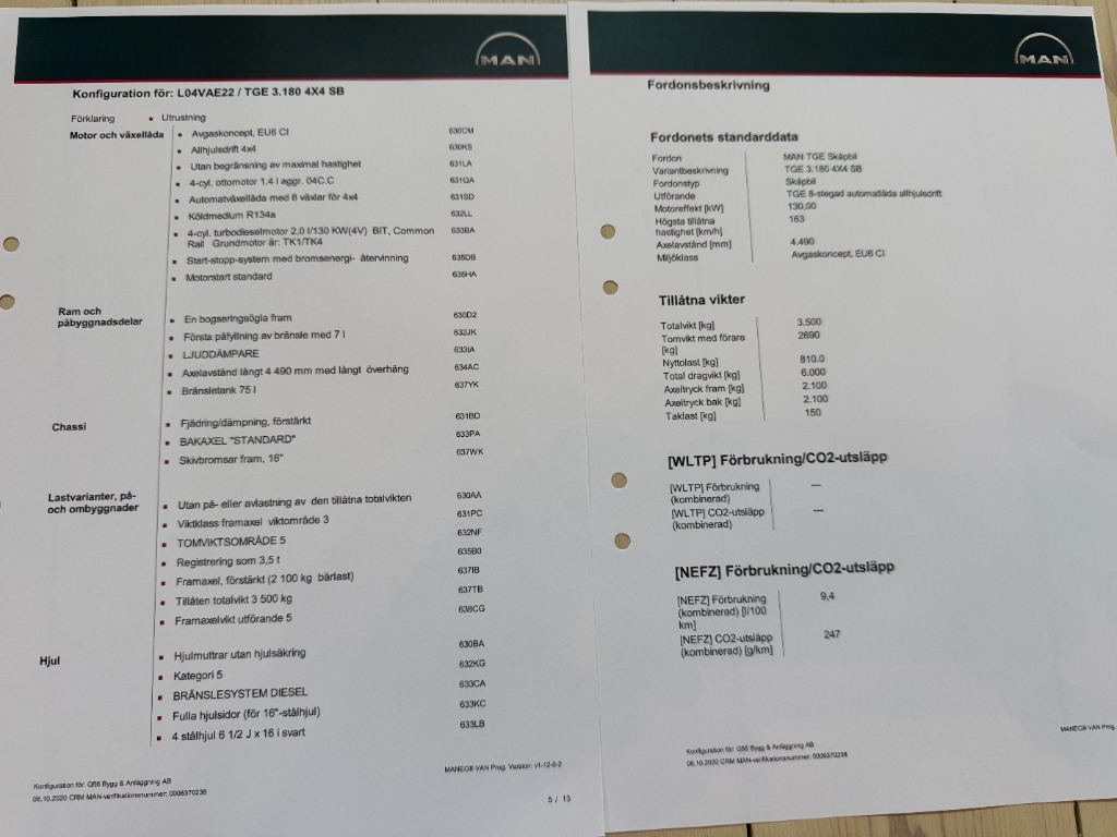 - AnteckningarLastbilsregistrerad SN byggnation inredning Dieselvärmare 2 kW fram Dieselvärmare 6 kW skåp Registrerad för 4 passagerare 2 passagerar stolar bak 4 WD Parkeringsradar Rattvärme Ledramp fram Kök Kylskåp Led innerbelysning Utökat ljudsystem Extra batteri med laddare Drag Sommardäck Vinterdäck 2 nycklar Se dokument för fullständig specifikation